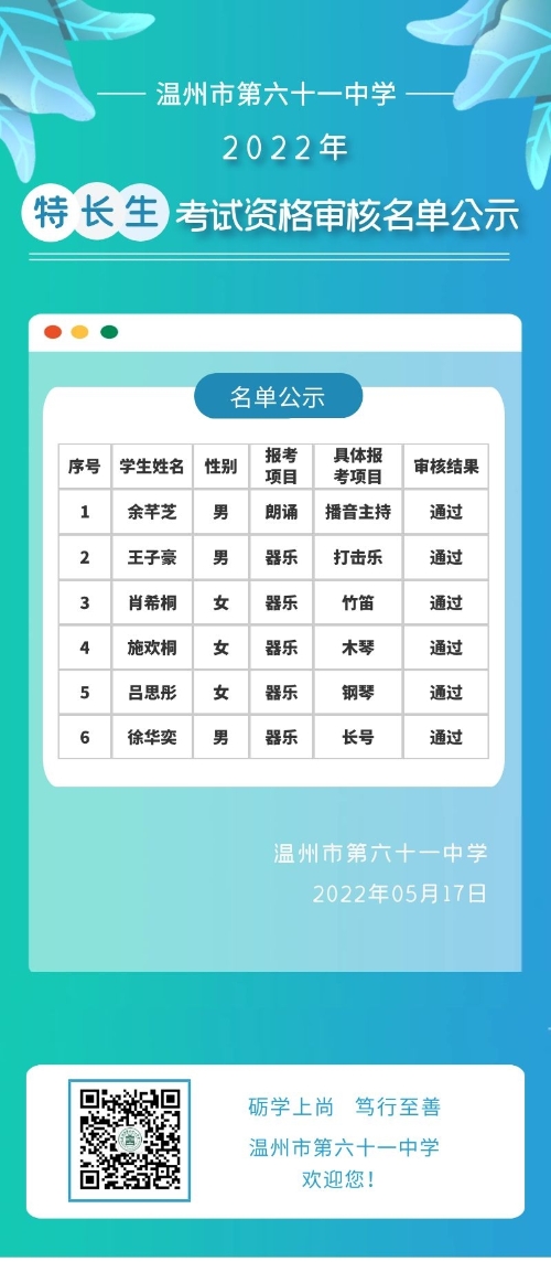 温州市第六十一中学2022年特长生考试资格审核通过名单公示